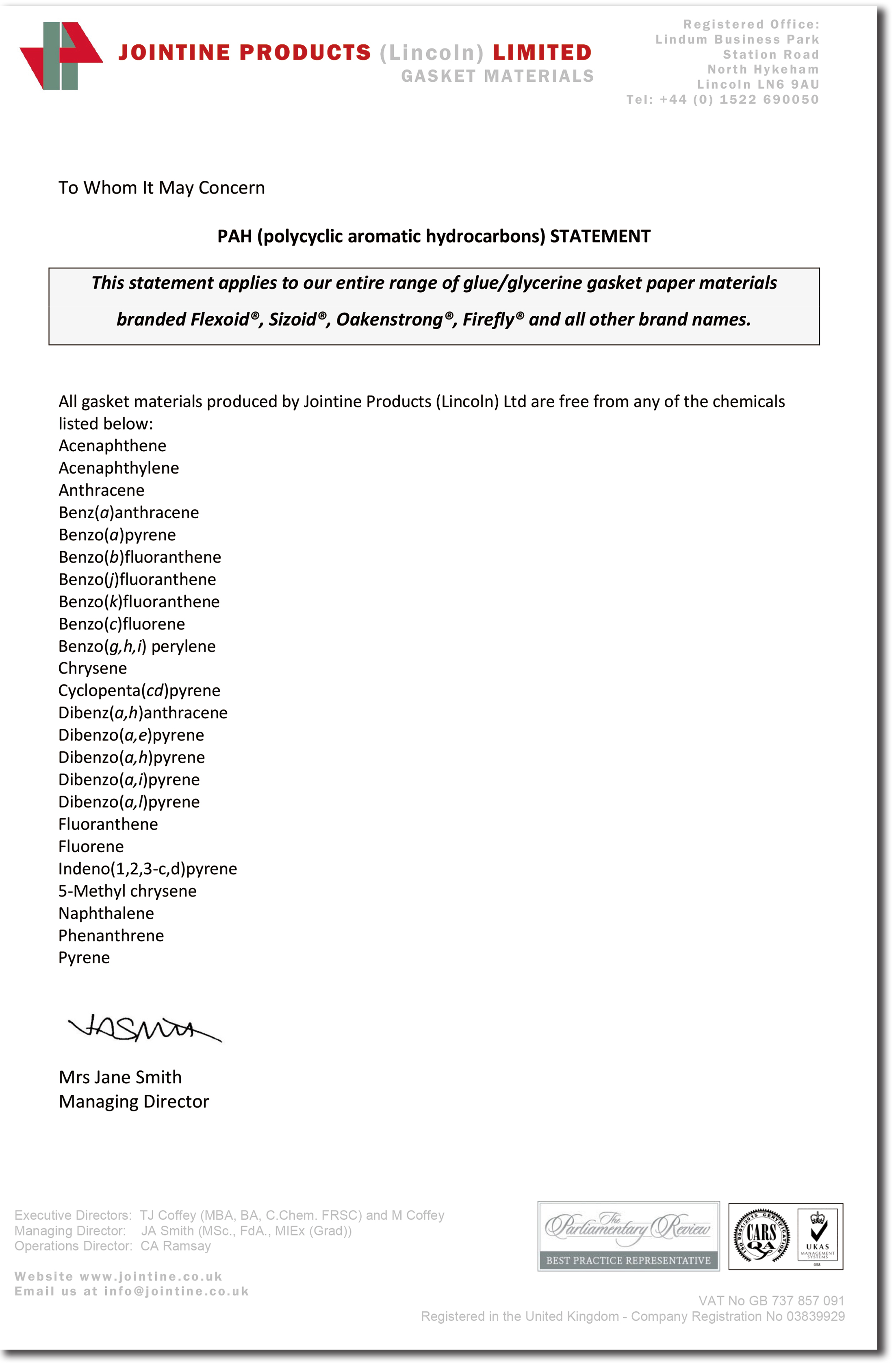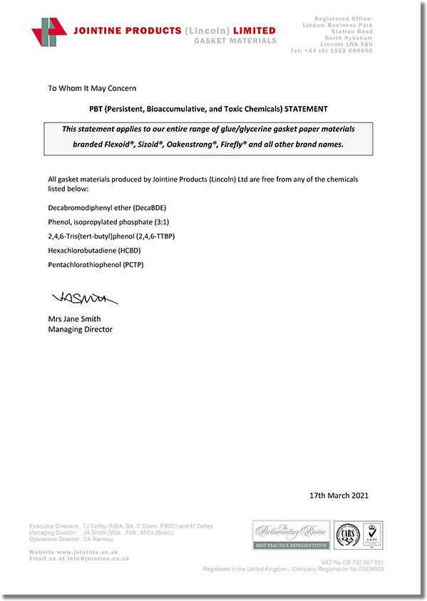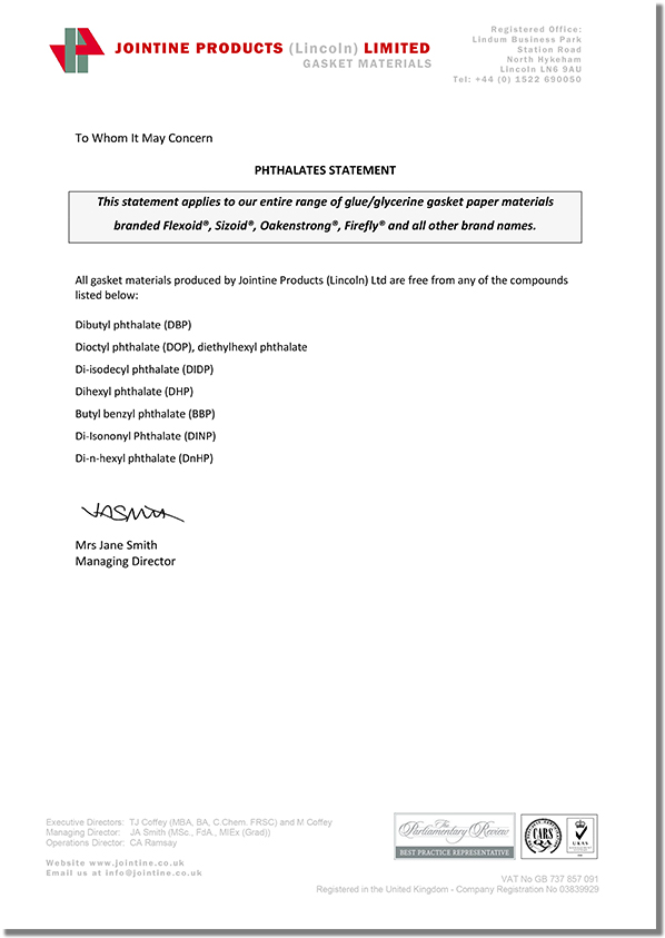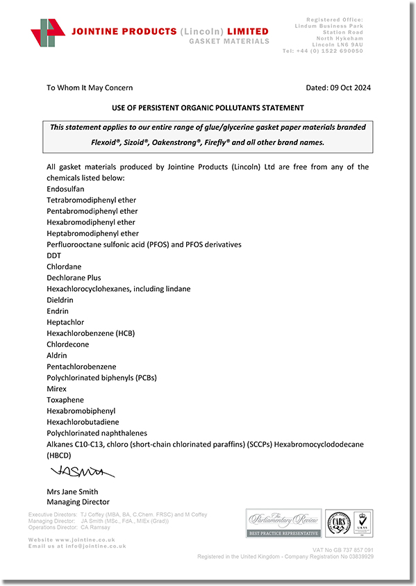JOINTINE是全球領先的高質量耐油植物纖維紙墊片材料制造商,其名下的品牌產品Flexoid/福來德、Cranflex是一種環保的耐油纖維紙墊片材料,可廣泛應用于汽車、發動機、傳動設備等行業,如下是JOINTINE發布的環保聲明函。